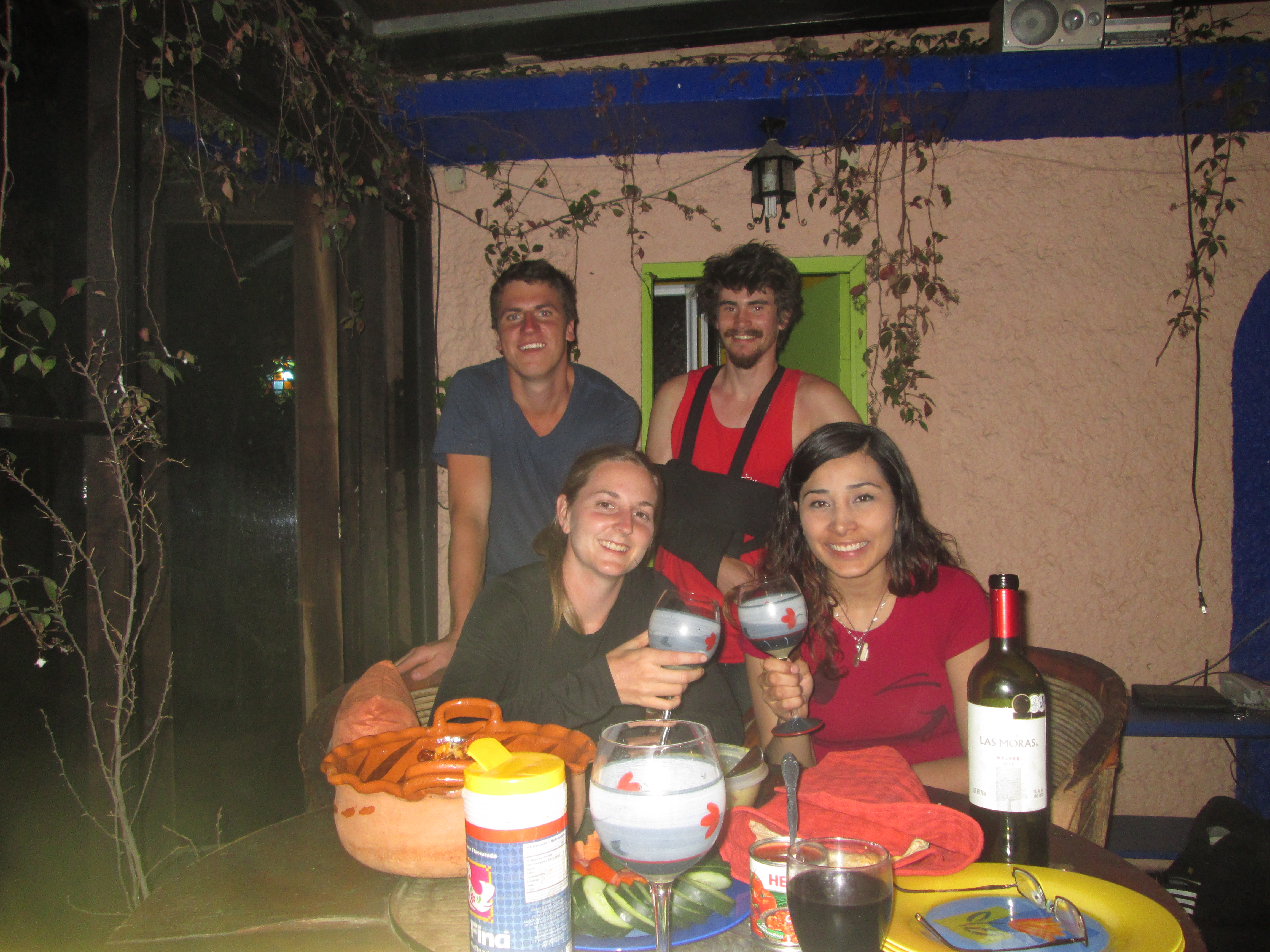 Here’s a photo of the four of us – myself, Susana, James (Englishman), Chio – toasting a (tasty) meal I cooked.